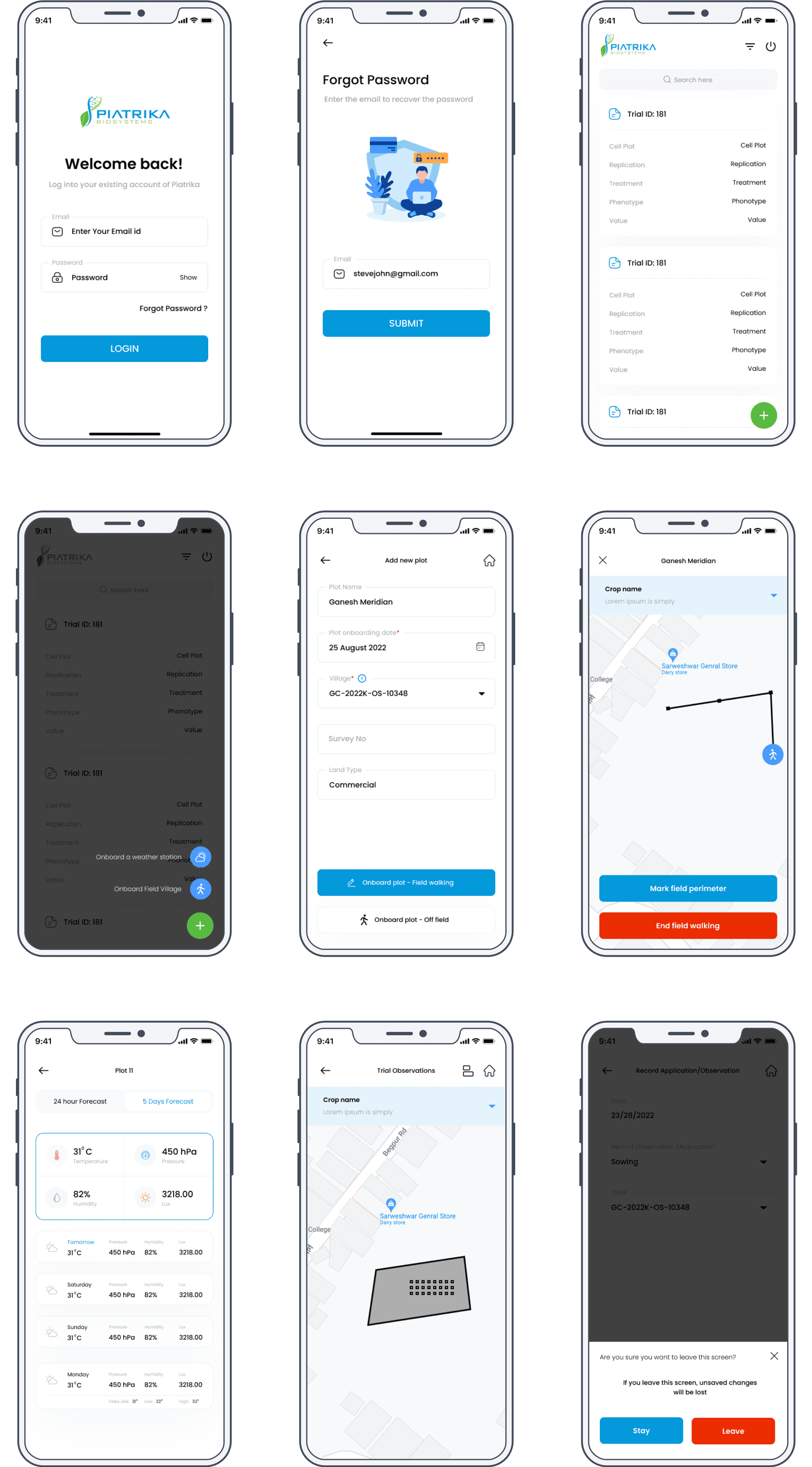 Piatrika Biosystems is a mobile application designed to provide agronomists and farmers with a platform to manage agricultural trials effectively. The app offers features like tracking trial IDs, cell plots, treatment data, phenotypes, and more. It allows users to add new plots, onboard weather stations, track field walking activities, and record observations and collections for different crop types.