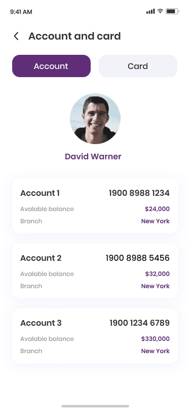 Easily view and manage multiple bank accounts in one place. Users can check available balances, account numbers, and branch details instantly, ensuring quick access to essential financial information.