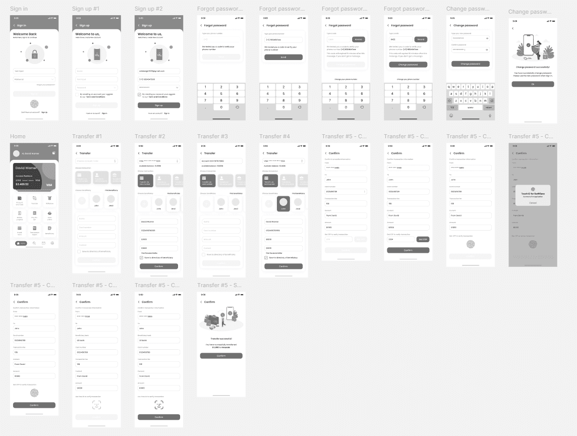 The mid-fidelity wireframe outlines the core layout, structure, and user flow of SwiftSave without focusing on final visuals. It highlights key functionalities like account overview, money transfer, bill payments, and navigation ensuring usability, clarity, and a smooth user experience before moving to high-fidelity design.