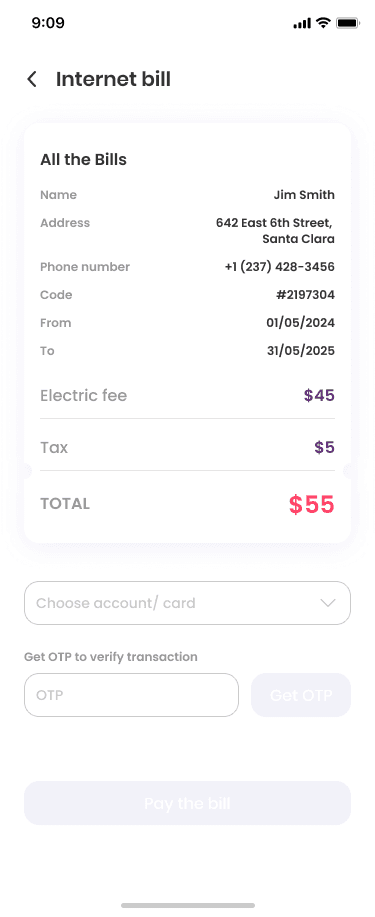 Easily manage and pay your internet bills with a clear breakdown of charges, billing period, and provider details. The intuitive layout ensures quick reviews and instant payments no more delays or switching between platforms. Stay connected effortlessly.